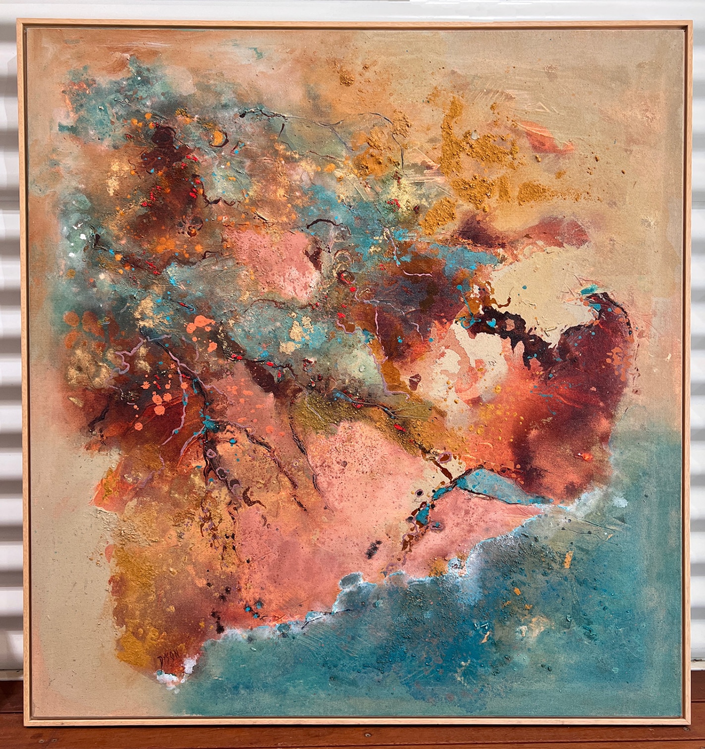 Acrylic and Kimberley ochre on stretched canvas with timber shadow-line frame