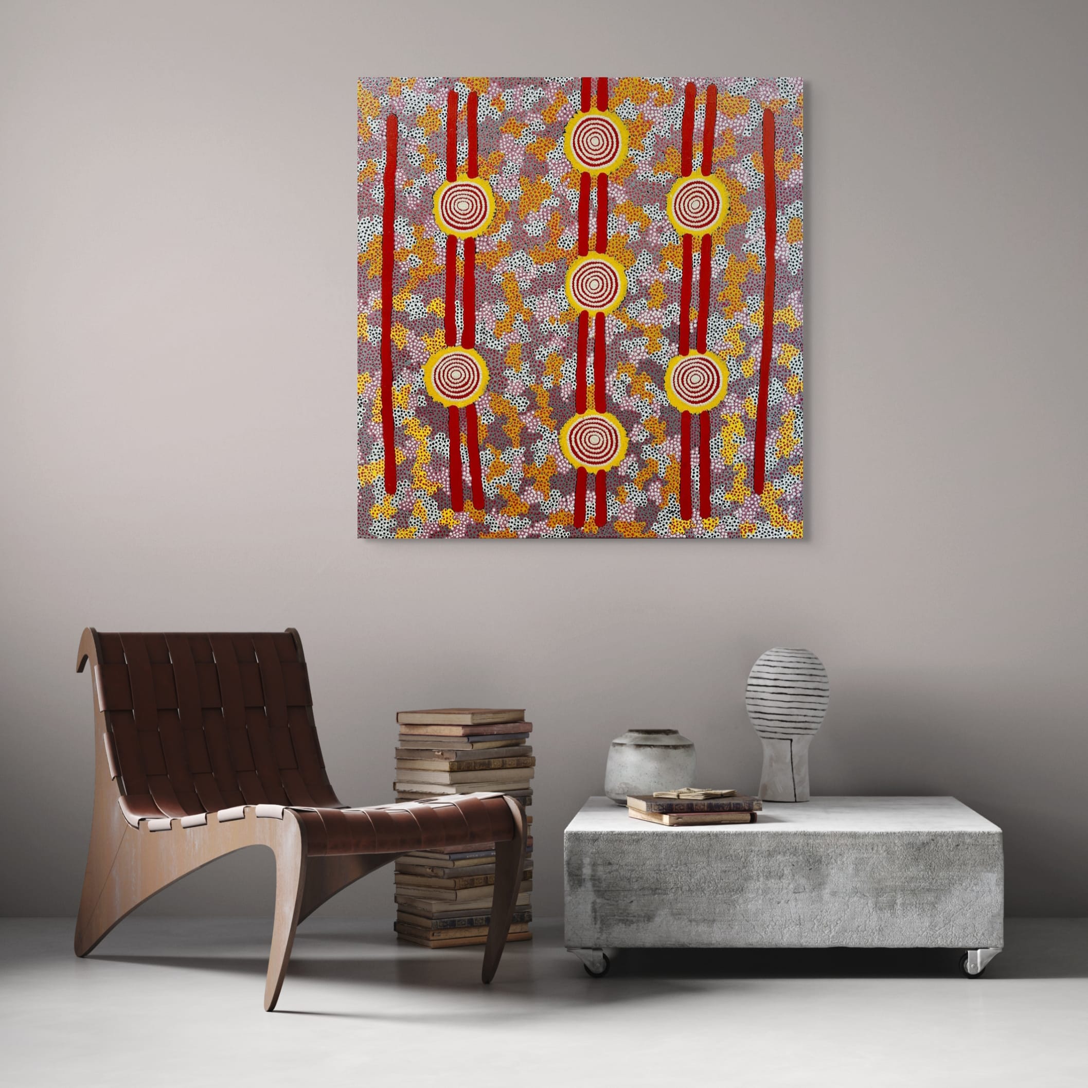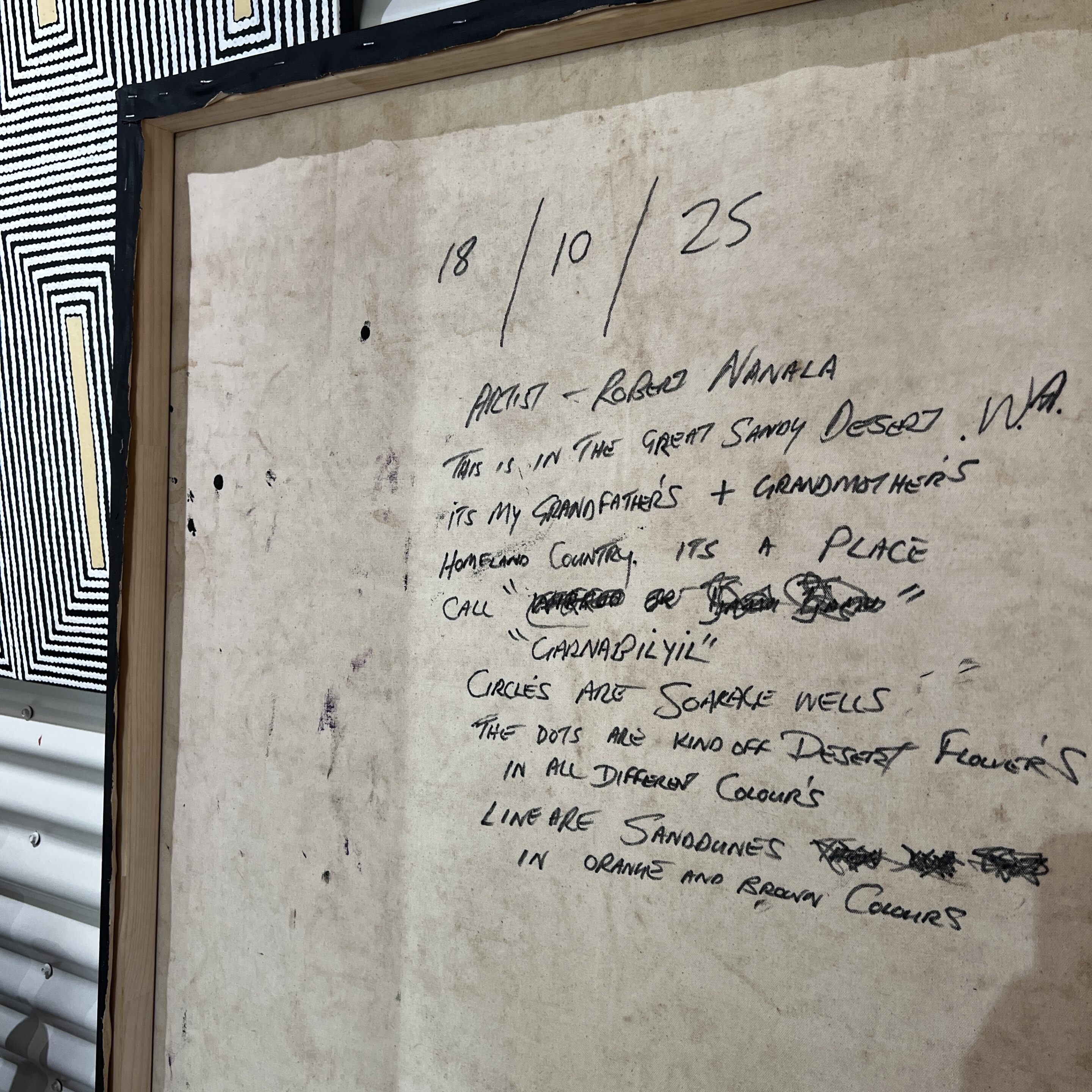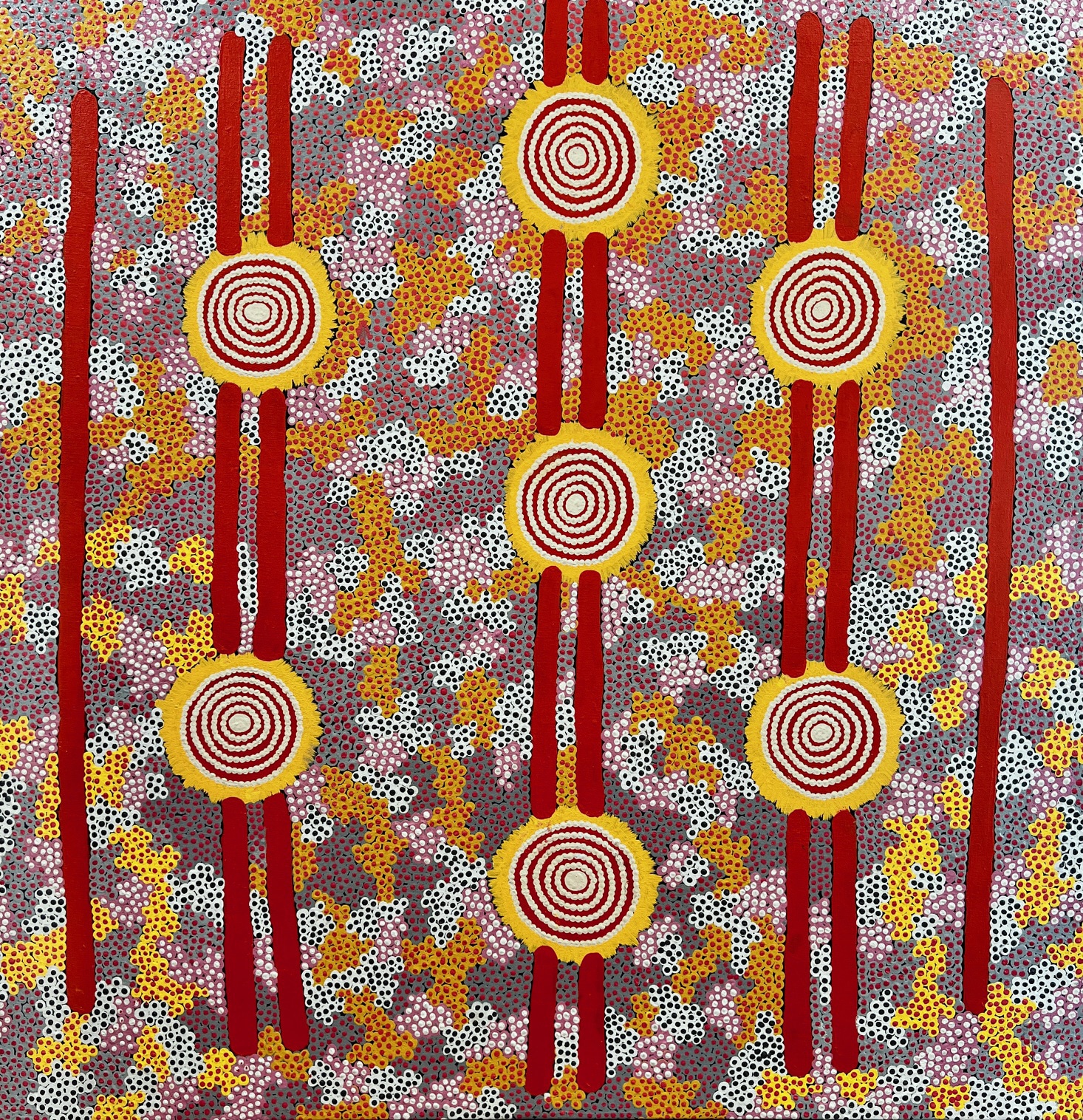 This is the Great Sandy Desert. It’s my Grandfathers and Grandmothers homeland country. It’s a place called Garnabilyil, after the rain. Circles are soakage wells. The dots are desert flowers in all different colours. Lines are Sandunes on orange and brown colours.