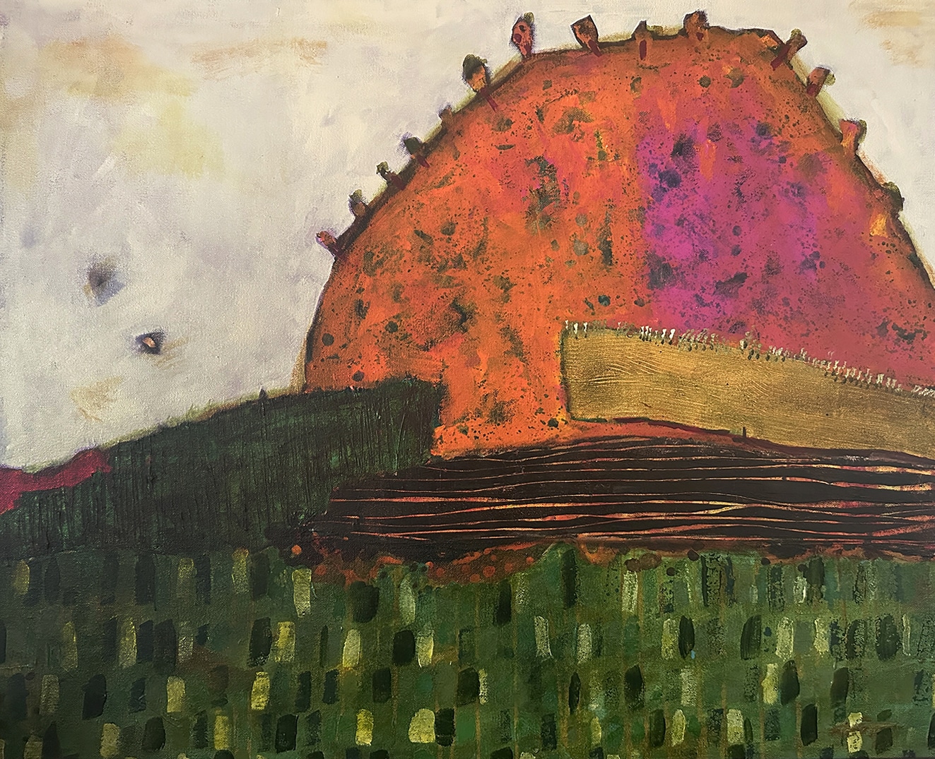 This was painted while on the road, we were camped at a waterhole, and I incorporated both the waterhole and hill into the one image. I remember being over taken by toads seeking the same waterhole.