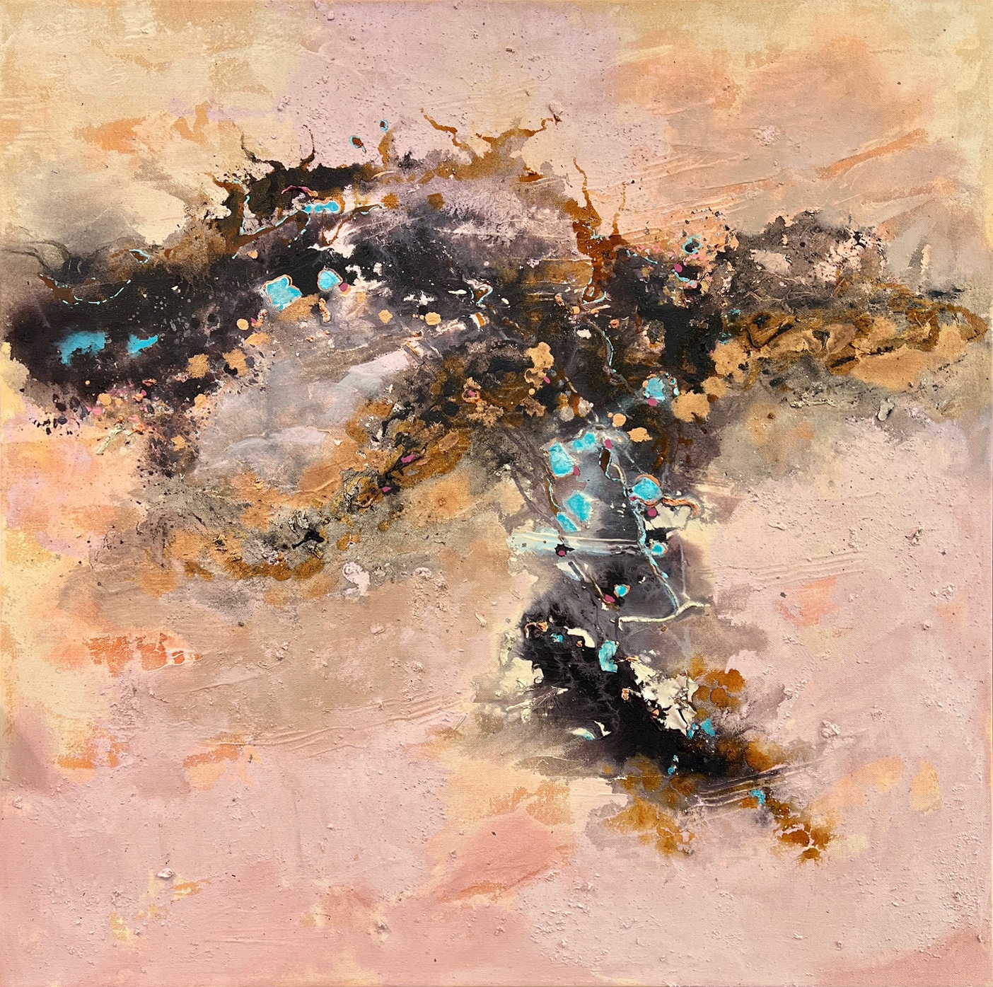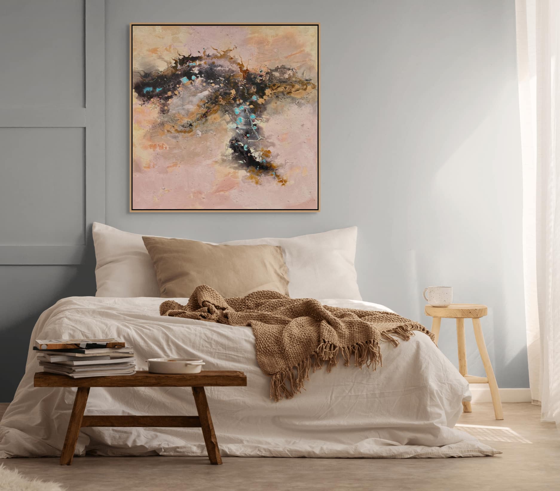 Acrylic, ochre and resin on stretched canvas with timber shadow-line frame