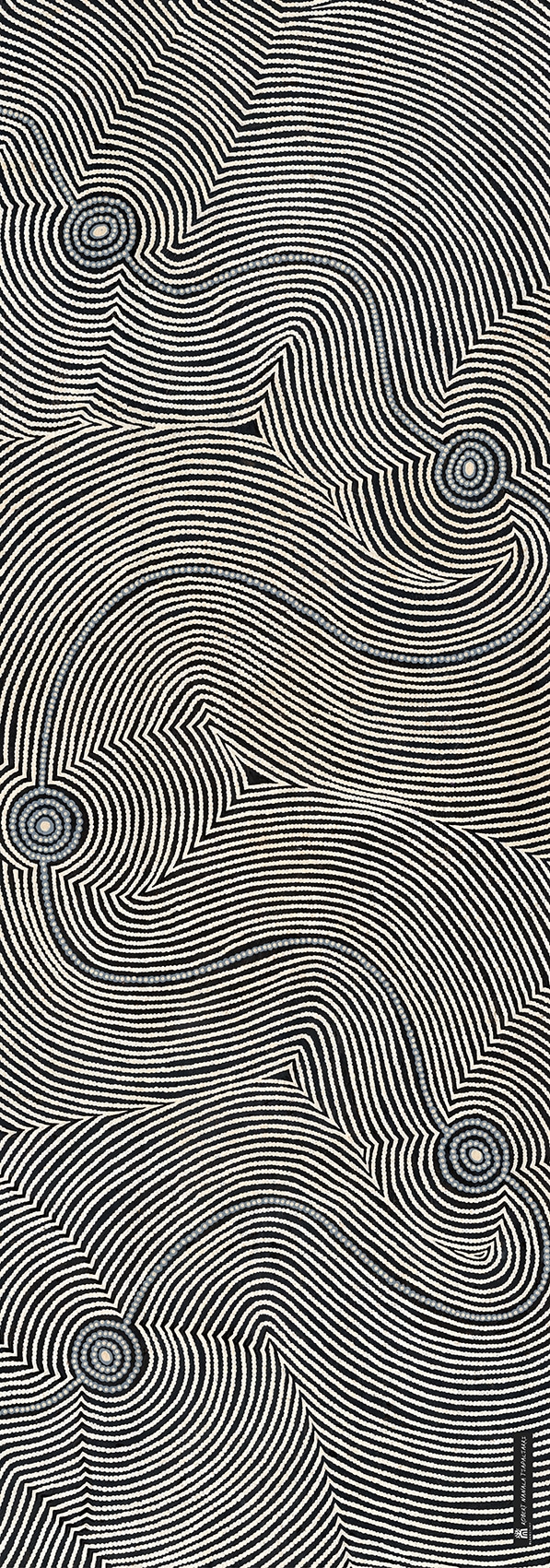 Design LIDWATI – ‘This is the Great Sandy Desert WA. This is my Mother’s birth place. Place called ‘Lidwati’. Circles are soakage wells, lines are dry river beds, white lines are spinifex.’