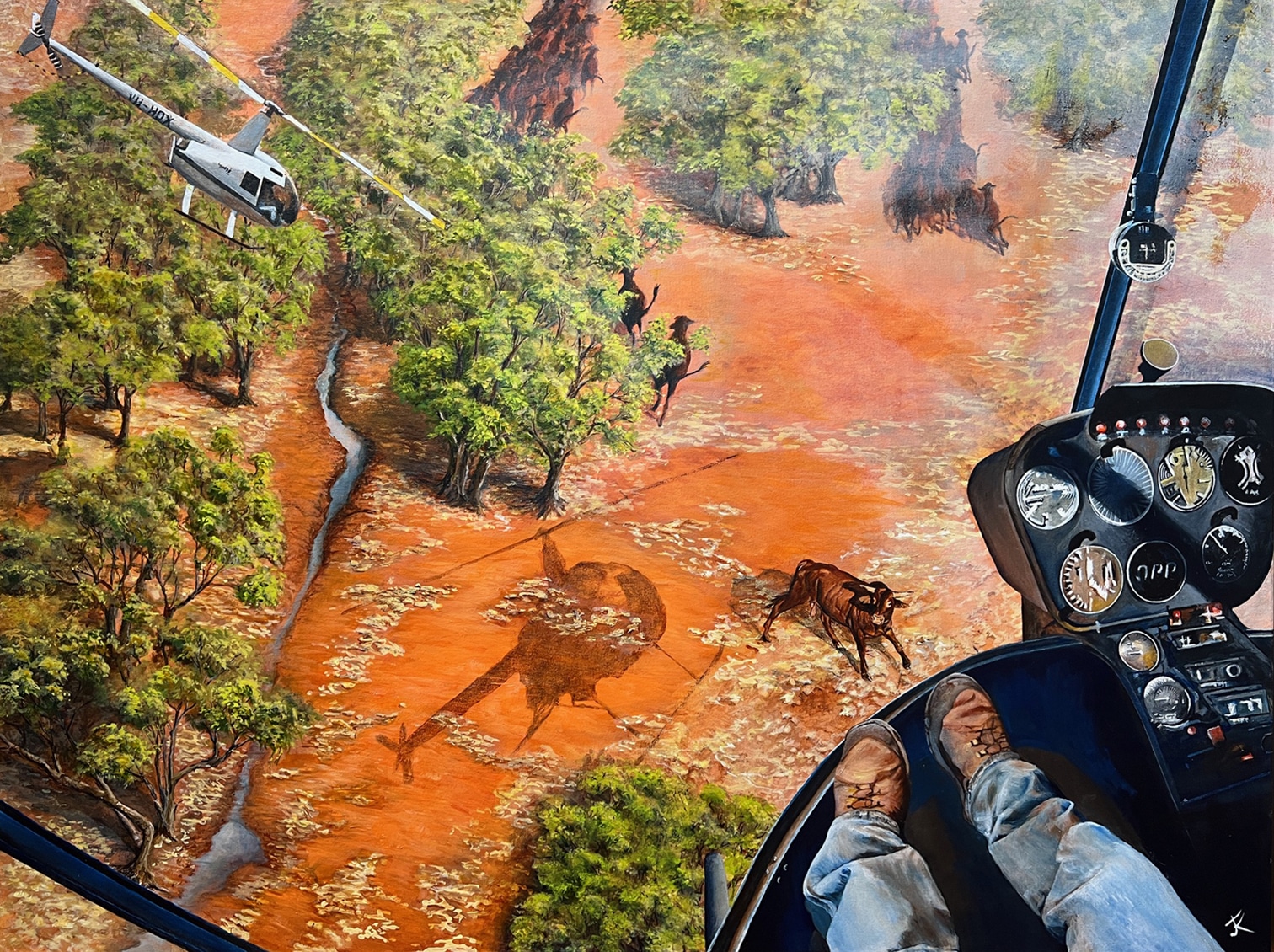 Kelly once again shows his distinctive skillset in challenging traditional perspectives within contemporary art in Stand Off, a narrative centering on a defiant bull and the pilot working to force him to conform to the herd. An interesting and challenging piece for the artist, Kelly reworked this to include the perspex reflection found within the cockpit of the helicopter.